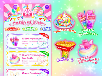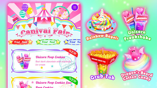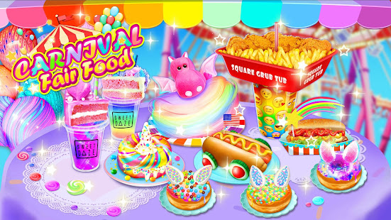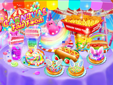 - Cook yummy carnival fair foods for kids such as unicorn chef cake, cotton candy, pogos, ice cream, rainbow slushy, classic American hot dog, French fries, fried noodles, corn dogs, popsicles, crispy donuts and so much more in this carnival game