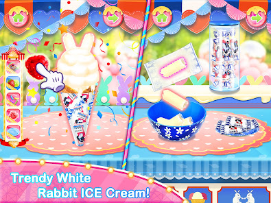 - Tons of food materials and decorations for kids to try: sausages, bread, chickens, potatoes, fruits, candies, sprinkles, milk, flour, salt, butter, eggs, food coloring, ice cream, cream, water, rock candies, white rabbit candy, unicorn chef decorations and so much more in this carnival game