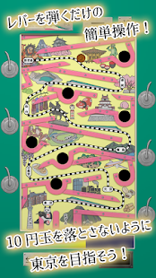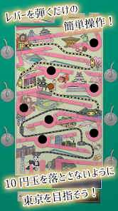 左右にあるレバーを弾いて10円玉を飛ばしながら、穴に落ちないよう終点の東京を目指しましょう。