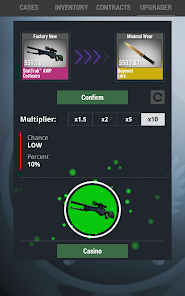 アプリは、ケース、インベントリ、契約、ジャックポット、コインフリップ、ルーレット、ショップ、コレクション、アップグレード、取引の 10 のタブで構成されています。タブを切り替えるには、その名前をタップするだけです。