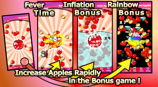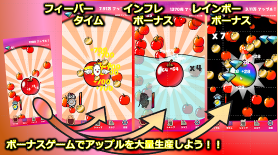 ・タップ自動化アイテム、タップパワーを上昇アイテム、特殊効果のアイテムでリンゴ回収の効率を爆上げしよう。