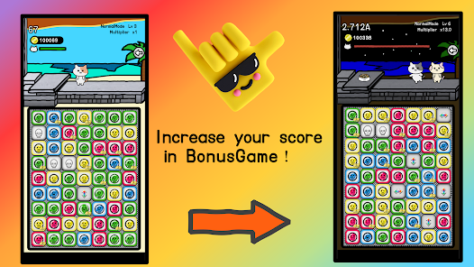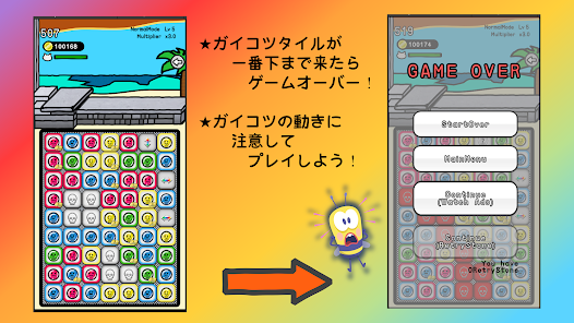 ・一回のタップでより多くタイルを消し、得点倍率を高めよう。
