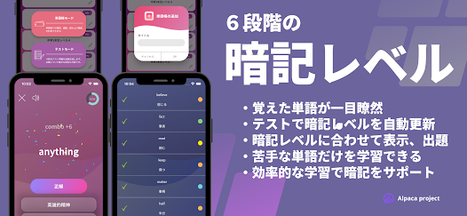 ・テストの結果に合わせて「暗記レベル」を自動更新、覚えた単語が一目瞭然