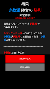 カウンターモードがONだと、「投票」で狼を当てたとしても、多数派のお題を当てられば狼の勝ちとなります。