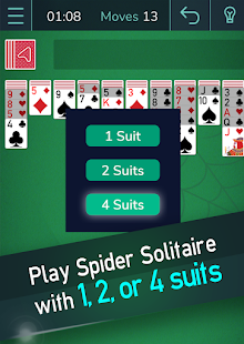 このスパイダーソリティアゲームを好みに合わせてカスタマイズしてください。水平パイル、大きなカードデッキ、さまざまなレイアウト、チャレンジ、その他 その他 を備えた唯一のゲームをプレイしましょう!いつでもどこでもソリティアのニーズに合わせて、4つ、2つ、または1つのスーツのスパイダーソリティアから選択します。