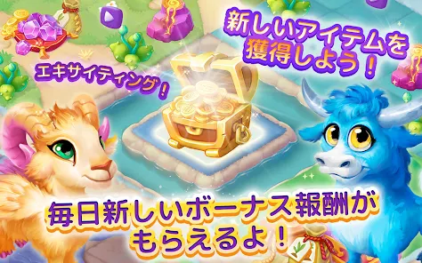 マジカルな宝物が待っています ルビー、コイン、魔法のワンド、魅惑的な宝箱を集めて、あなただけのすばらしい世界をどんどん大きくしていきましょう