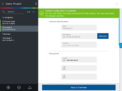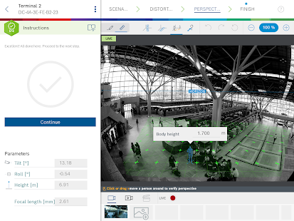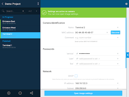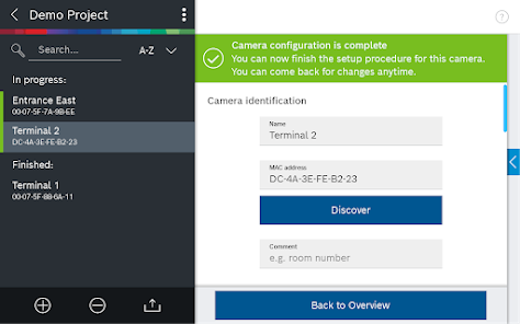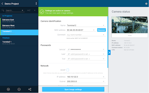 On site, those pre-configurations can simply be pushed onto the installed camera, making the installation and configuration procedure easier and less time consuming. Previously configured cameras can be integrated and updated as well. The camera's field of view can be viewed and adjusted along with other image settings via the app itself. A comprehensive report of the commissioned cameras is automatically generated.