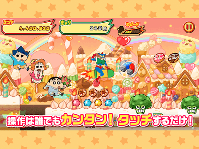 ・猛ダッシュするしんちゃんをタッチで障害物をかわしながら、お菓子を集めていこう