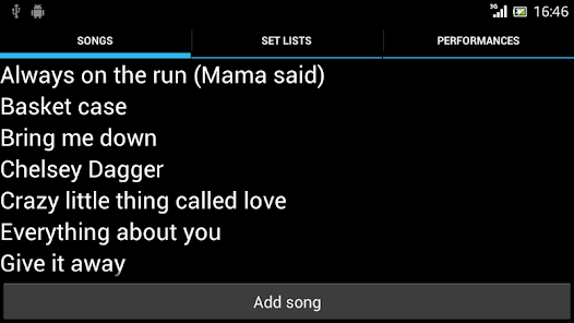一方では、曲を維持し、リストとパフォーマンスを設定し、他方では、パフォーマンスを「再生」することができます。この「ライブ」モードでは、現在および次の曲のタイトル、アーティスト、メモ、および追加設定が表示されます。パッチ番号や好きなもののように。それに加えて、曲と一緒に保存した正しいテンポで点滅するテンポバーを表示させることもできます!ボタンを押すか、次の曲または前の曲に移動できます...