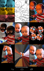 Effects include: maze, engraving, cube puzzle, bouncing balls, glasses, TV, waving flag, sketch, tunnel, mosaic, puzzle, hue shift, motion blur, tile, emboss, spinning cube, x-ray, collage, night vision, light tunnel, and many more. There's also 40 vintage camera effects for a retro feel.