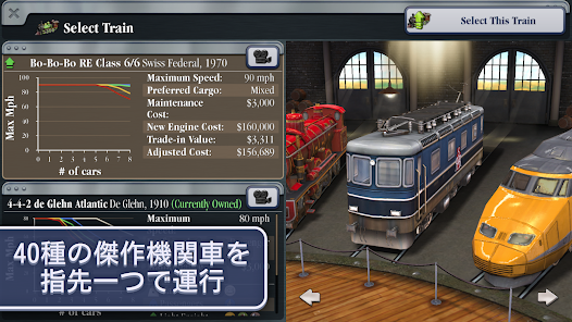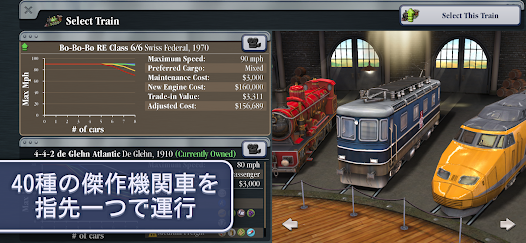 歴史を飾った重要な機関車でプレイ。スティーブンソンの「プラネット」号をはじめとする初期の蒸気機関車から、フランスの高速鉄道TGV、そしてその歴史に現れては消えたイノベーションの数々。