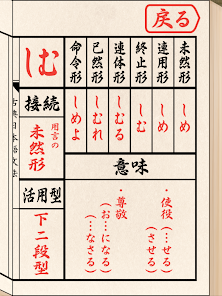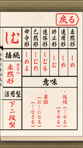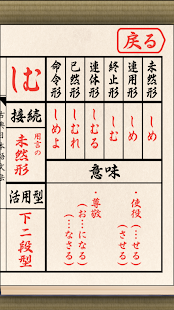 このアプリで古文の最も重要な知識を学習することができます。日本古典文学で最もよく出てくる文法を体系化し、動詞・形容詞・助詞・助動詞・連体詞・敬語のカテゴリに分け、その活用や使い分けなどもわかりやすい表に整理しました。意外につまずく助動詞の接続・間違いやすい敬語の用法をやっと気持ちよく学習することができます。練習には『枕草子』や『徒然草』などの古典文学冒頭部分のほか、知識のレベルを確認するため700問以上のテストもあります。
