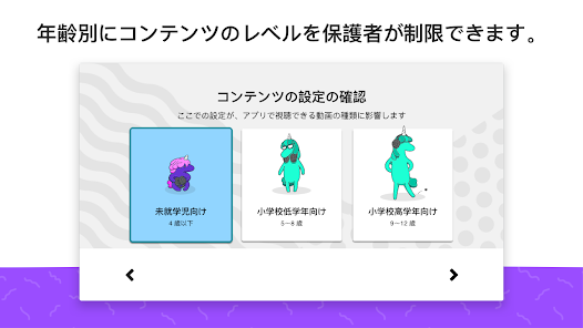 YouTube Kids は、お子様に適した環境を提供することで、お子様自身が楽しく簡単にコンテンツを見つけられるようにつくられたアプリです。また、お子様に合わせて視聴環境を管理できる、保護者向けの機能も用意されています。詳しくは youtube.com/kids をご覧ください。