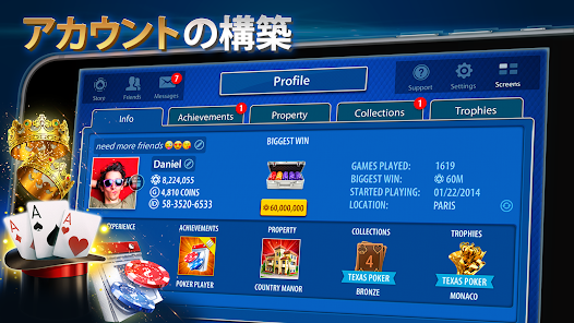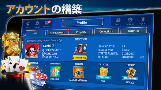 • 自分のプロフィールページ これまでのゲームの進み具合やデータが見られます経験値を貯めてレベルアップこれまでに勝ったブラックジャックトーナメントや、達成した実績を見てみましょう。ユニークな所有物でプロフィールページを飾ることも他の人のプロフィールを見て、自分と比べてみましょう