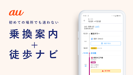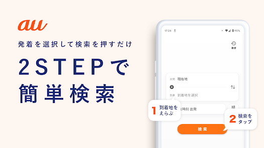 auナビウォークプラスは、『最短2STEPで検索』できる『シンプルで見やすいルート』で、快適に乗換検索・ルート案内をご利用いただけるので、通勤・通学やお買い物・旅行など、あなたの毎日の移動にお役にたてます。