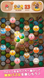 ブラウンやコニーをかたどった、かわいいブロックを6方向に動かして、同じ色を3つ以上揃えるとブロックが一気に消えてストレス発散
