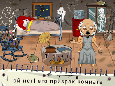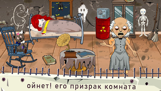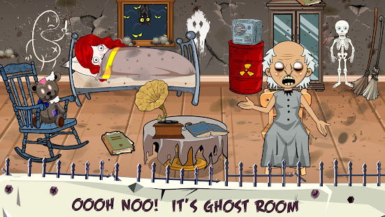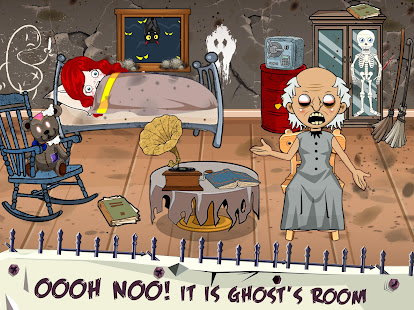 恐怖の行為で寝室に向かって走ります。 幽霊がベッドの後ろを見ています。 キャビネットは、協力モードで生き残るためのより安全なシェルターです。 しかし、恐ろしいおばあちゃんのふりをする家の幽霊も、ピップホラーゲームお化け屋敷シティホラーゲームmtから来ています。