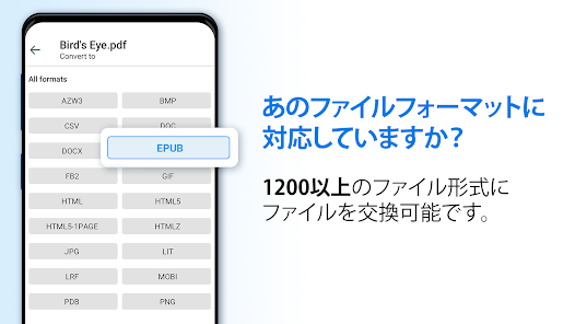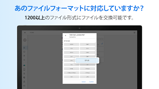 File Commanderでは、何の苦労もなく、様々なファイル形式を扱うことができます。最高なのは、互換性のないファイル形式を扱わなければならないイライラとさよならできることです。このファイル変換サービスを利用すれば、互換性のないオーディオやビデオファイルを再生可能なMP3、MP4、WMV、MOVなどに変換できます。あらゆるPDFを写真やドキュメントへと素早く変換することができます。1200以上の異なるファイル形式をサポートしているので、もう互換性の問題を気にする必要はありません