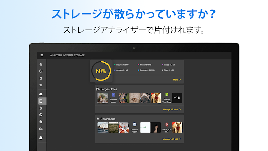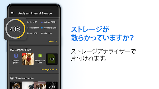 ストレージ分析アプリは、何が最も大きなスペースを占めているのかを視覚化し、どのファイルを削除するか、他のストレージに移動するかを提案することで、乱雑なストレージを整理し、重要なアプリやファイルのためのスペースを確保できるようお手伝いします。