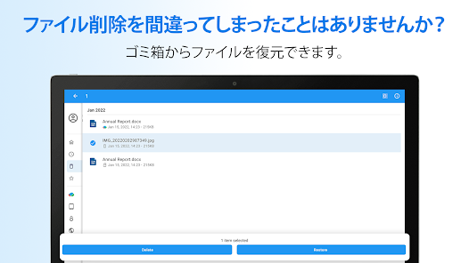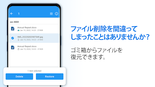 弊社が誇る究極のファイル管理ソリューションは、誤って削除してしまうことを防止しますFIle Commanderのごみ箱を使えば、デバイスの内部ストレージやSDカードから削除したすべてのファイルやフォルダを復元して管理することができるので安心です。