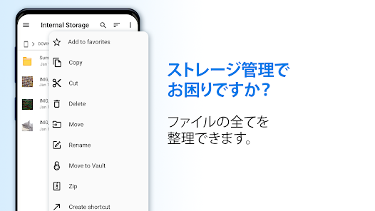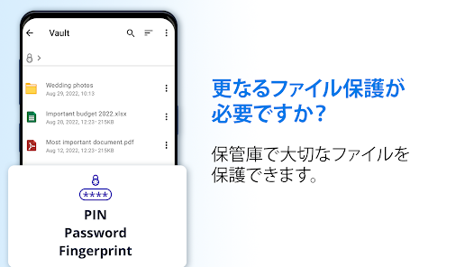 最もセンシティブなファイルを保管庫に隠しましょう私たちのファイルエクスプローラは、暗証番号での保護、指紋認証、パスワードでロックダウンすることにより、個人的な写真やビデオを保護します。保管庫は、個人的な写真やビデオを隠すための唯一の場所です。File Commanderの保管庫があれば、ゼロ知識暗号化モデルを使用してプライバシーを保護し、ファイルをセキュアにすることができます。