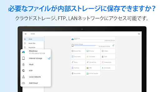 File Commanderには、5GBの無料MobiDriveクラウドストレージPremiumでは50GBが付いています。弊社クラウドでは、インターネット接続の必要がないMobiDriveファイルへのスマートなオフラインアクセスに加え、ファイルとフォルダの簡単な共有機能を利用できます。
