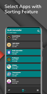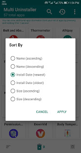 Multi App Uninstaller also supports app search and sort. Type keyword in the text box on the top to search the app that you want to uninstall. Click menu then sort icon to sort the apps in many sort types