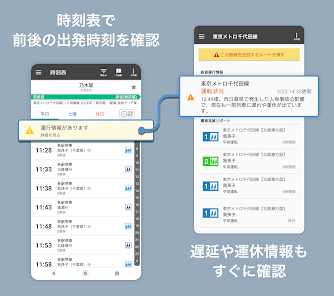 運行情報が発生している区間のみを回避し最適な経路案内ができるので、遅延,運休に合った時も安心です。