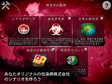 研究所でパワフルかつ便利なツールを使いこなし、あなたオリジナルの伝染病株式会社のカスタムシナリオを作成しよう。新たな伝染病タイプや世界、イベント等を作って友達や 8500万人以上のプレイヤー達にシェアしよう