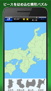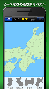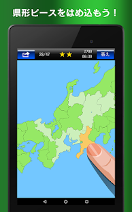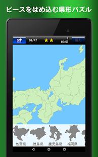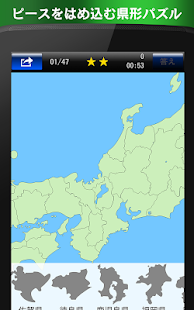 「パズル」モードでは県形のピースを正しく当てはめて日本地図を完成させてください。初級と上級で、376問のパズル問題が楽しめます。