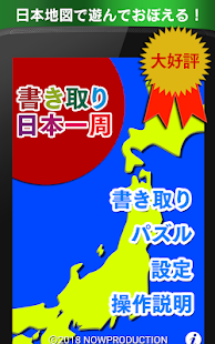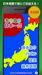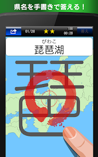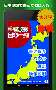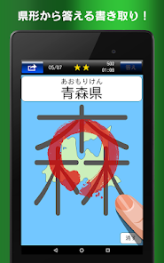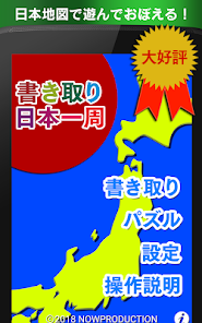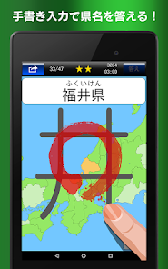 「書き取り日本一周 FREE」は日本地図から出題される全国の地名、県名、山、湖などの名前を手書きで答える「書き取り」ゲームです。
