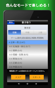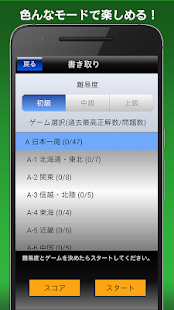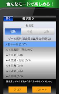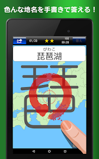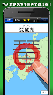 「書き取り」モードでは地名を画面に指で書いて答えます。初級~上級まで、1200問以上の問題に挑戦できます。