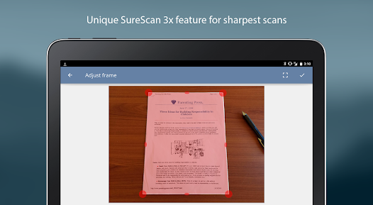 TurboScanは、さらに、シャープなスキャン用の当社の専有スキャンモード、SureScanを提供します特に、低照度条件で便利です。SureScanには、電話のカメラで一つの文書を3回撮影することを必要とします。