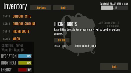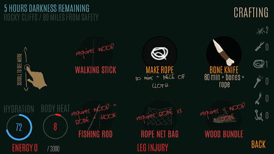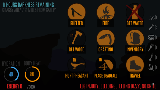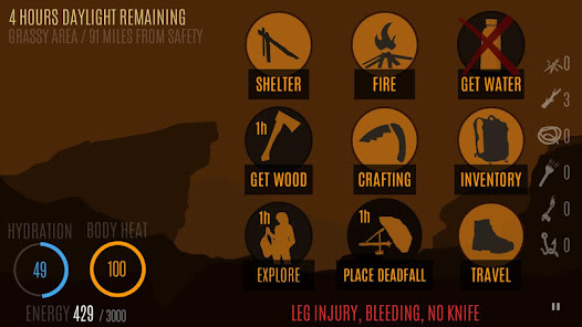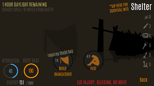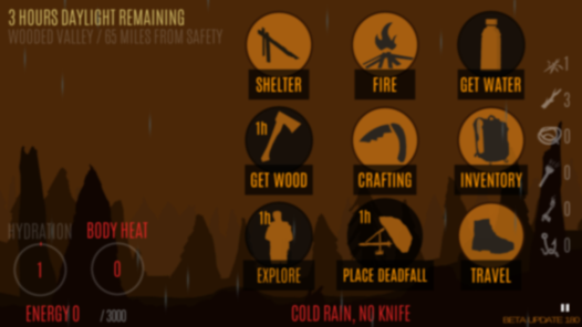 生き残り、安全に旅行してみてください。荒野のサバイバルをテーマにしたシミュレーション。避難所の建設、食料、水、旅行、薪の収集など、生き残るためにどのように時間を過ごし、どのような行動が今最も重要であるかを判断する必要があります。