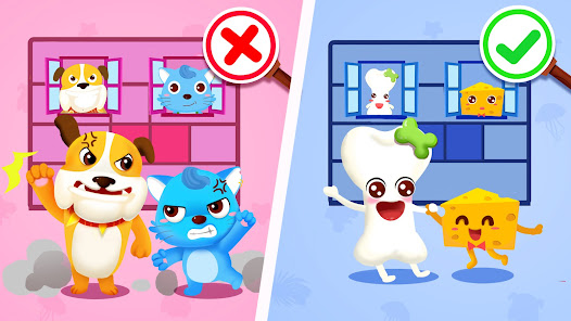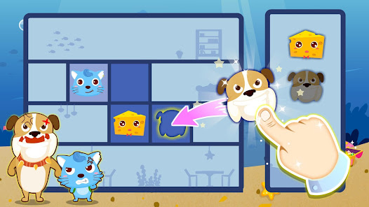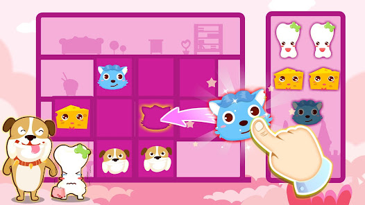 ネズミさん、ネコちゃん、ワンちゃん、ほねこちゃん、チーズさん、魚ちゃんの相性を考えながらステージクリアを目指せ!3つの場面と45のステージがあります。ステージが難しくなっていくと考えるのが楽しくなっていきます。子どもの思考力・集中力を育てるのに最適な知育アプリです。