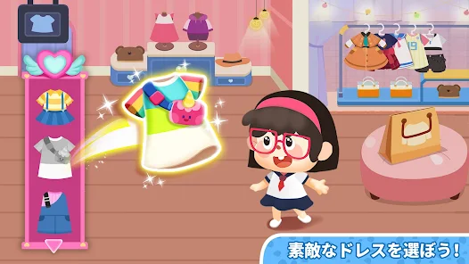 アパレルショップに新商品が登場プリンセスドレス、帽子、チェーンバッグ、どれがいいぜひ試してみてねショッピングで疲れたら、ラウンジでひと休みしましょう。ソファの横でファッション雑誌を読んで、退屈しのぎもできるよ。
