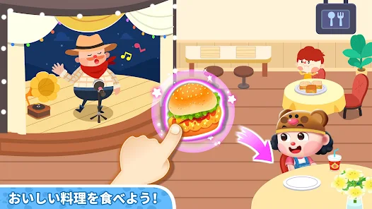とても良い匂いだなぁあローストチキンだ一体どこからわぁミュージックレストランだ中に入って、他の料理も見てみよう素敵な音楽を聴きながら、美味しい料理を楽しめるなんて、最高だね