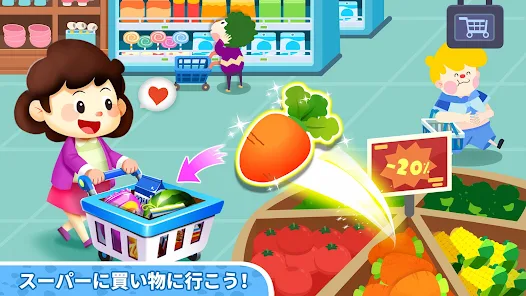スーパーには、果物・おもちゃ・日用品など、あらゆる商品が揃ってるよ。必要なものを買いにいこう キャンディーがセール中みたいだよ買っておこうキャンディを買う前に、重さを量るのを忘れないで