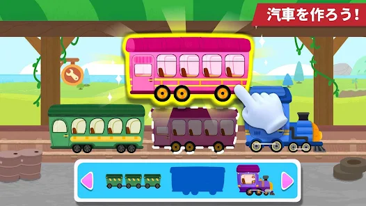 きかん車を選んで、客車を連結しよう。貨物車も忘れずに連結してね。わあ君のきかん車、カッコイイ自分だけのきかん車で出発進行しよう。