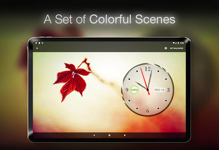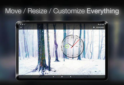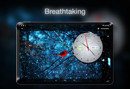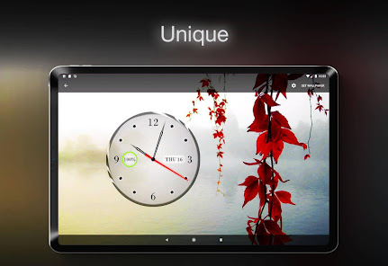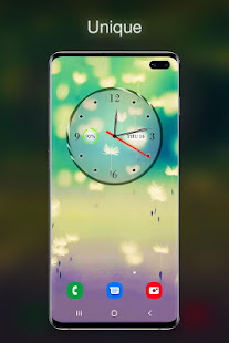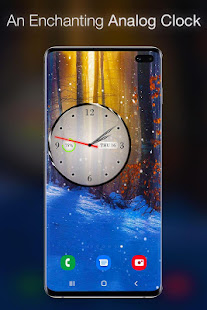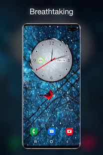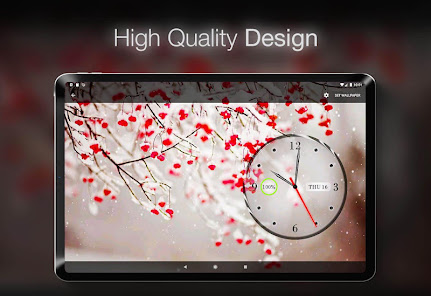 設定メニューから、多くの種類のアナログ時計デザインから選択できます。時計アニメーションの背景には、選択可能な背景のセットが付属していますが、独自の写真ギャラリーから背景を選択することもできます。アナログ時計の位置とサイズは変更できます。また、バッテリーレベルインジケーターとカレンダーの日付インジケーターのオン/オフを切り替えることもできます。時計のアニメーション背景は、携帯電話で許可されている場合、アニメーション背景、ロック画面、またはその両方として使用できます。