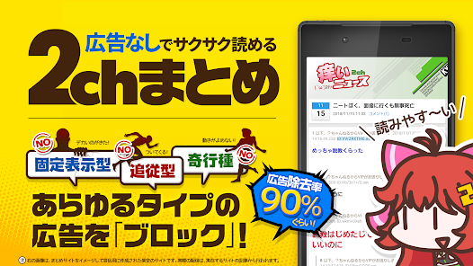 2chまとめアプリでは、2ちゃんねるまとめサイト内に表示される広告を程良く除去しています(90%程)。