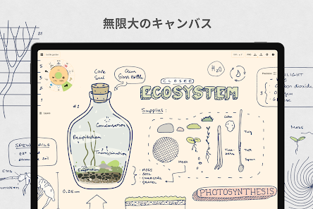 「コンセプト」は、発想力、企画力、創造性を広げるための柔軟なスペースです。無限キャンバスでアイデアをスケッチしたり、傾きと筆圧機能を使ってノート取りや落書きをしたり、ストーリーボードやプロダクトスケッチ、デザインプランを作成したら、クライアントや友達、外部アプリと共有することもできます。最新のペン対応デバイスとChrome OS™ に最適化されています。