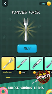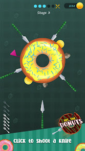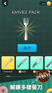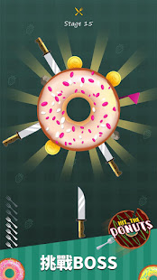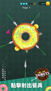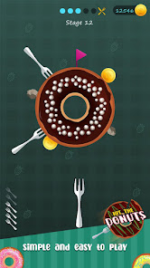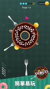 The donut will rotate irregularly, sometimes fast and sometimes slow. Through the control of the tableware, touch the screen to throw the tableware out, avoid overlapping, and at the same time, you can hit the surrounding gold coins and exchange the gold coins for a variety of tableware. If there is an overlap, the level will fail and you need to start again until all the utensils on your handle are inserted on the donuts before you can clear the level.