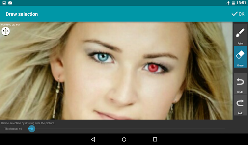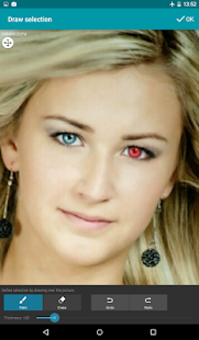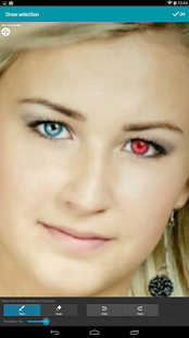 ➤ Tools: brightness/contrast, color levels (RGB & hue, saturation), auto-levels, sharpen, blur, mosaic, quantization, noise, emboss, sketch, ... Every tool in this cool photo editing app may be applied to a selection: automatic selections (magic wand) or manual (drawing), with zoom option, make you able to edit anything: red eye fix, backlight corrections, set saturation, hue or color of a single object or person, remove spots, blur skin, ...