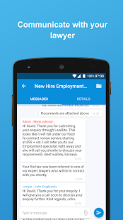 このアプリは、クライアントと弁護士の経験を合理化するための高度なツールでもあり、あらゆる商業法務に関する完全な資格を持つ弁護士との法的な問題を解決するのに役立つリアルタイムのコミュニケーションを提供します。