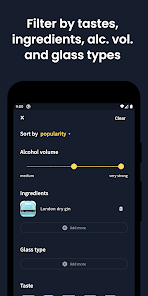 - Search cocktails by ingredients, alcohol volume, taste, or glass type