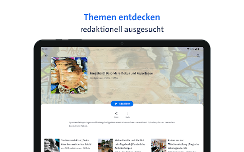 Stöbern Sie in den Rubriken oder nutzen Sie die Suche, um genau die Inhalte zu finden, die Sie interessieren. Sie können Sendungen abonnieren, Audios vormerken und eigene Playlists erstellen. Über den ARD-Login können Sie diese Inhalte in Ihrem Konto speichern und so auch geräteübergreifend nutzen. Lassen Sie sich von Empfehlungen inspirieren und teilen Sie über die Sharing-Funktion mit Freunden, was Sie begeistert!