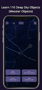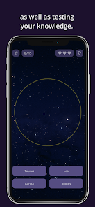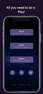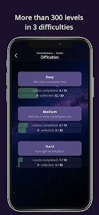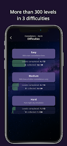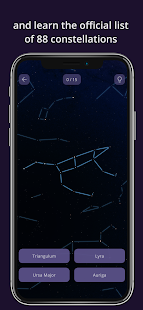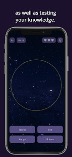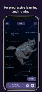 - 各レベル (イージー、ミディアム、ハード) の 3 つのトレーニングとテスト モードでスムーズに進行し、実際の夜空の星座と星を認識できるようにガイドします。