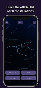 - 123 のレベルで、国際天文学連合によって定義された 88 星座すべての知識を教え、訓練し、テストします。