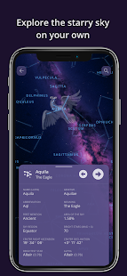 探索画面 (メイン画面の 3 番目のボタン) では、自分で空を探索できます。オブジェクト (星や星座の名前など) をタップすると、それらに関する詳細情報 (略語、最も明るい星、空の領域、明るい星、距離など) が表示されます。同じダブルタップ ジェスチャを使用して、すべての装飾をすばやく非表示/表示することもできます。検索アイコン (右上隅) を使用すると、関心のある特定のオブジェクトをすばやく見つけることができます。
